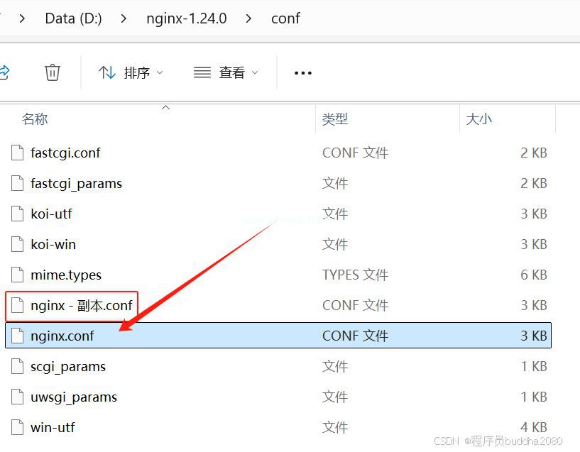 进入到conf目录,反手就给nginx.conf保存一个副本,然后去修改nginx.conf配置文件。