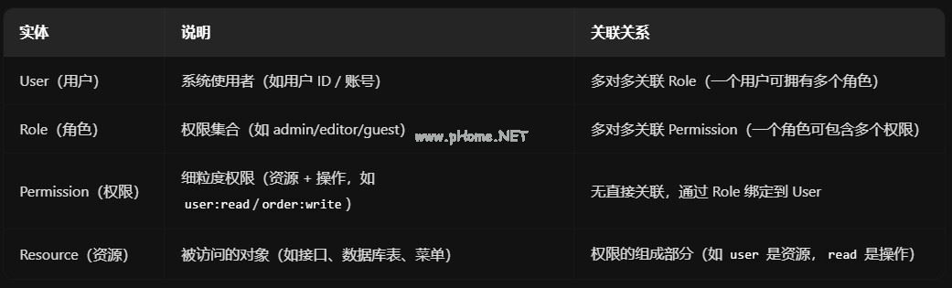 先明确 RBAC 最小权限模型(RBAC0)的核心实体及关系,这是实现的基础: