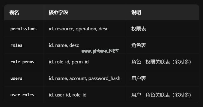 将 RBAC 数据(用户、角色、权限及关联关系)存储到数据库,推荐表结构设计: