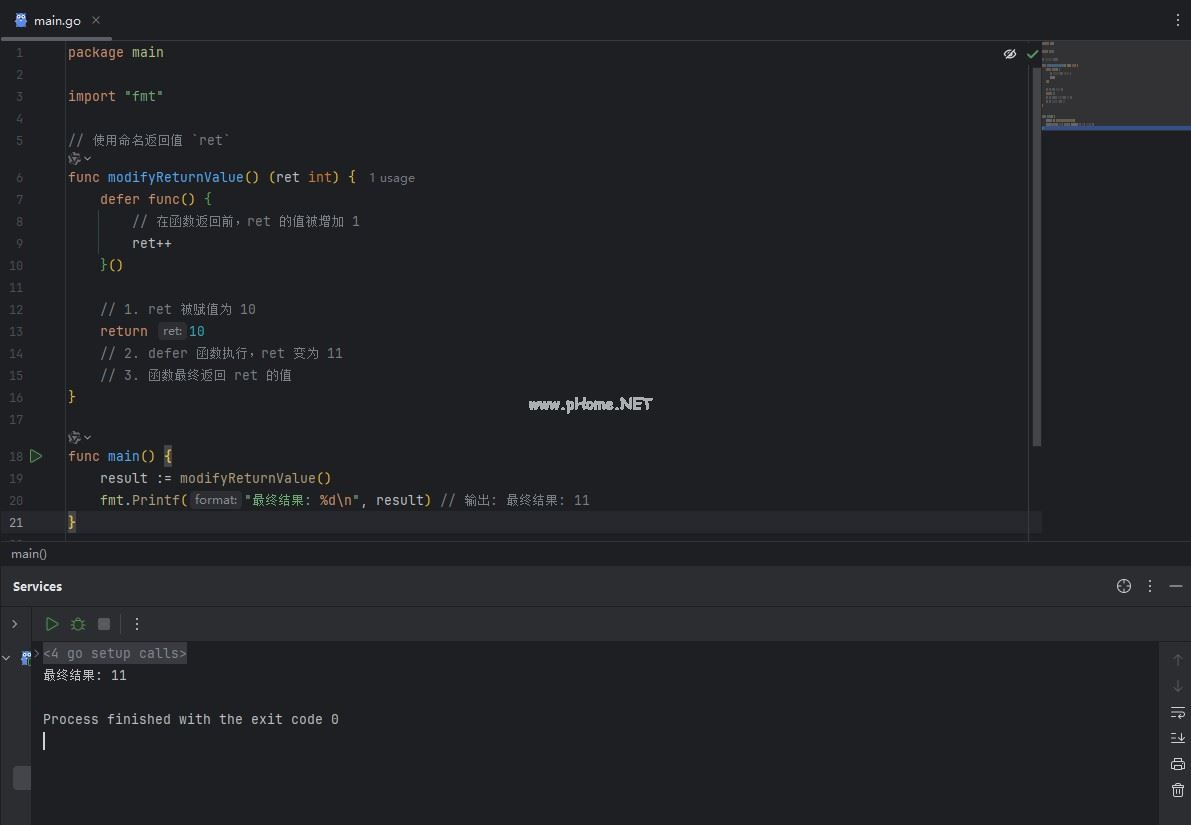 接着,执行 defer 中的匿名函数。该函数访问并修改了 ret,使其值变为 11