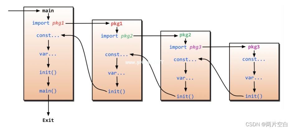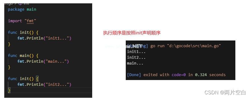 每个源文件都只能包含一个 init() 函数(此处存在错误)。初始化总是以单线程执行,并且按照包的依赖关系顺序执行。