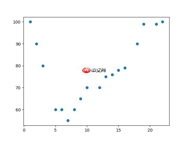 import matplotlib.pyplot as plt x = [1,2,3,5,6,7,8,9,10,12,13,14,15,16,18,19,21,22] y = [100,90,80,60,60,55,60,65,70,70,75,76,78,79,90,99,99,100] plt.scatter(x, y) plt.show()