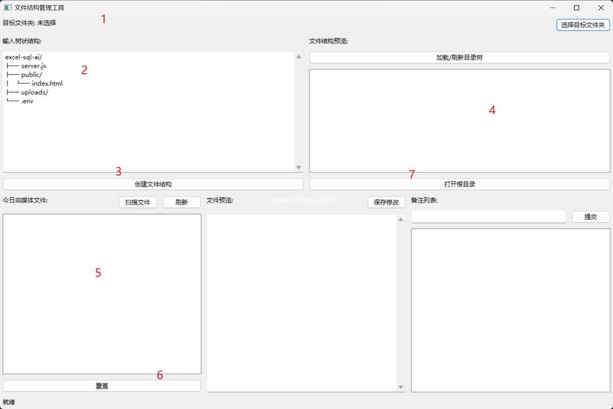 wx.TreeCtrl 树状视图。底部:集成文件扫描器、预览框和剪贴板备注工具。