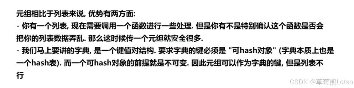 安全性: 传递数据时,用元组可避免数据被意外修改(比如传给一个未知函数,元组更安全);可作为字典的键: 后续要学的字典,键必须是 “可哈希对象”(不可变类型),元组可以,列表不行。补充: