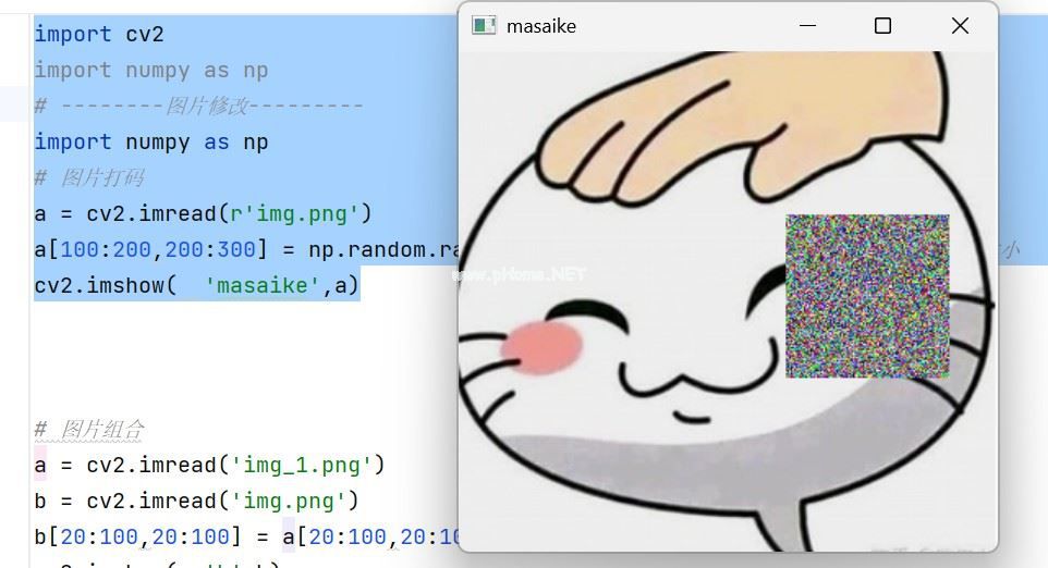 import cv2 import numpy as np # 图片打码 a = cv2.imread(r'img.png') a[100:200,200:300] = np.random.randint(0,256,(100,100,3))#矩阵赋值必须是相同大小 cv2.imshow( 'masaike',a)