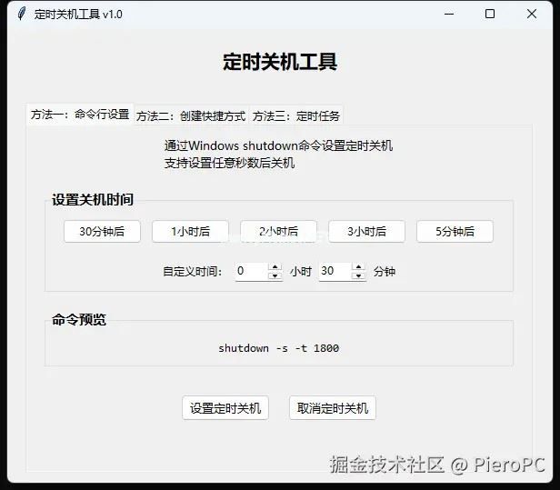 提供预设时间按钮(5分钟、30分钟、1小时等)支持自定义小时和分钟设置实时显示将要执行的命令设置和取消按钮方法二:创建快捷方式