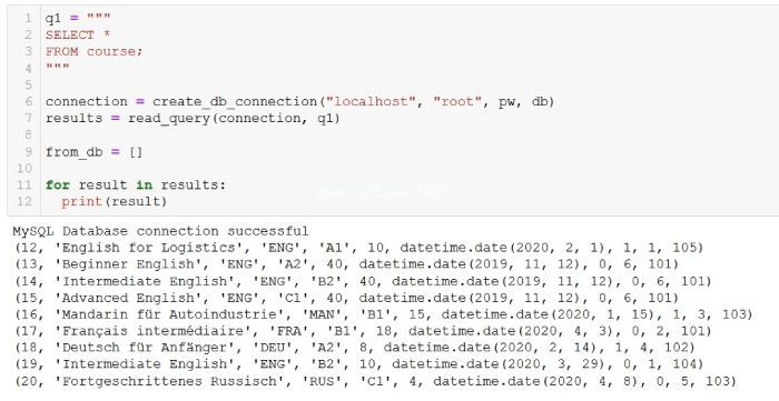 在上述代码中,首先通过 pymysql.connect() 建立数据库连接,然后使用连接对象创建一个游标对象 cursor 。使用 cursor.execute() 方法执行SQL语句。 fetchall() 方法用于获取查询结果,该方法返回一个列表,列表中的每个元素是结果集中的一个记录。