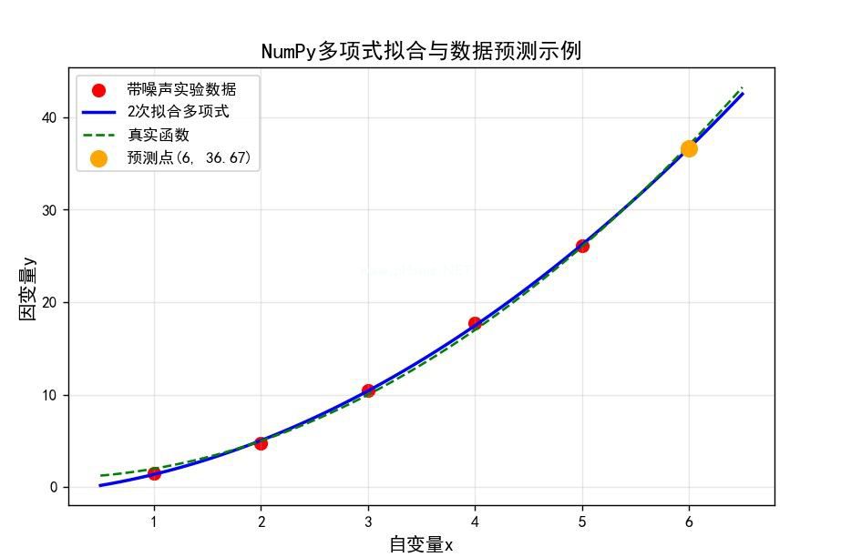 np.polyfit 得到的拟合模型,几乎贴合所有红色散点,说明模型成功捕捉了数据的二次函数趋势,消除了噪声干扰。橙色大点(预测点):对应 (x=6) 时的预测值,落在蓝色拟合曲线上,且接近绿色虚线的理论值(37),直观体现了拟合模型对 “未知数据” 的预测能力。整体来看,这张图清晰验证了:二次多项式拟合能有效还原带噪声数据的真实规律,且可用于可靠的数值预测。