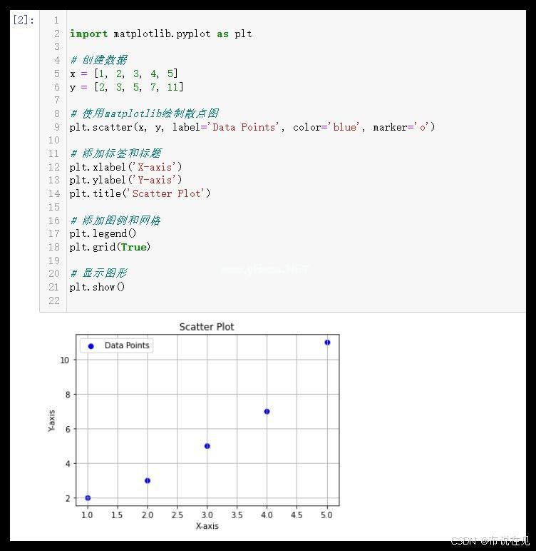 导入库:import matplotlib.pyplot as plt创建数据:x = [1, 2, 3, 4, 5] 和 y = [2, 3, 5, 7, 11]绘制散点图:plt.scatter(x, y, label='Data Points', color='blue', marker='o')添加标签和标题:plt.xlabel('X-axis'),plt.ylabel('Y-axis'),plt.title('Scatter Plot')添加图例和网格:plt.legend(),plt.grid(True)显示图形:plt.show()