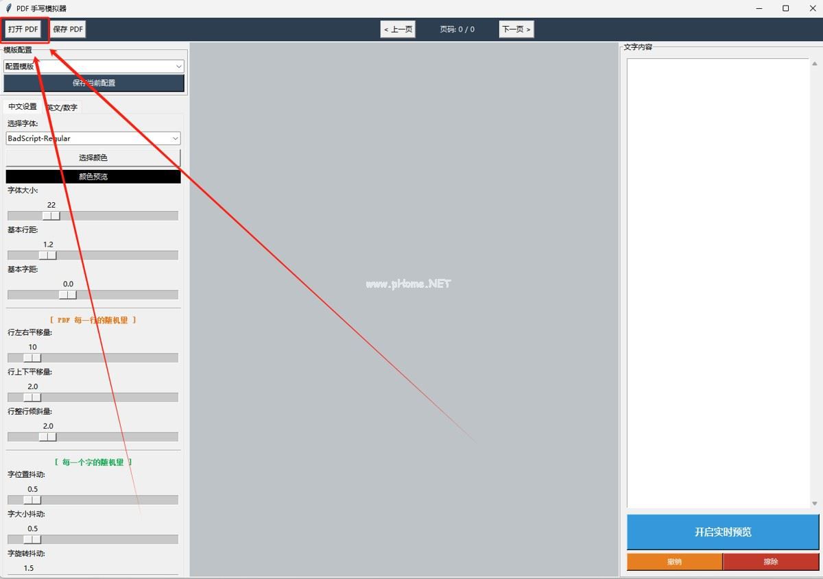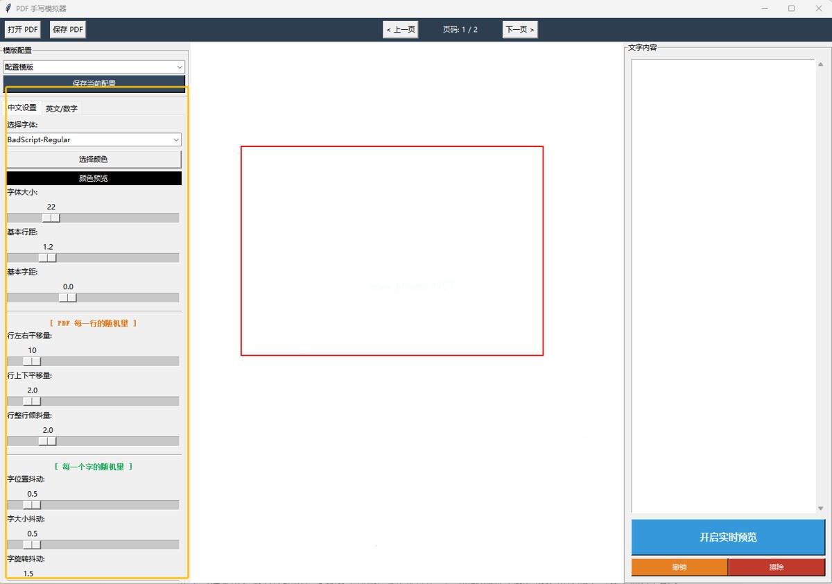 tkinter:Python 内置 GUI 库,无需额外安装,负责搭建整个应用的可视化界面,实现按钮点击、参数调整、文本输入、PDF 预览等交互功能;PyMuPDF(fitz):核心 PDF 处理库,提供高效的 PDF 读取、写入、页面渲染、文字插入、红act标注(擦除功能)等接口,是实现 PDF 编辑的核心依赖;Pillow(PIL):图像处理库,将 PyMuPDF 渲染出的 PDF 页面像素数据,转换成 tkinter 画布可显示的图像格式,实现 PDF 页面的可视化预览;JSON:轻量级数据格式,用于保存用户配置的手写参数模版(字体、大小、扰动值等),方便后续直接复用,无需重复调整;Python 随机数与数学计算:实现手写效果的「不规则扰动」,模拟真实手写的位置偏移、大小波动、行倾斜等特性;TTF 字体支持:读取自定义 TrueType 字体文件,支持切换不同手写风格字体,适配不同用户的手写习惯。最终效果演示
