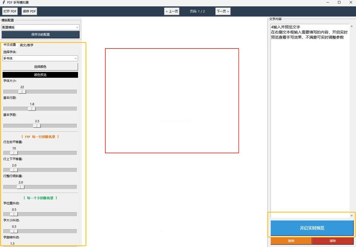输入并预览文字:在右侧文本框输入需要填写的内容,开启「实时预览」查看手写效果;