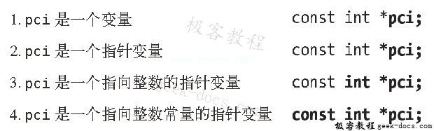 现在介绍一种阅读指针声明的方法,这个方法会让指针更容易理解,那就是:倒过来读。尽管我们还没讲到指向常量的指针,但可以先看看它的声明: