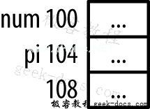 变量num和pi分别位于地址100和104。假设这两个变量都占据4字节空间,就像1.2节中所说,实际的长度取决于系统配置。除非特别指明,我们所有的例子都使用4字节长的整数。