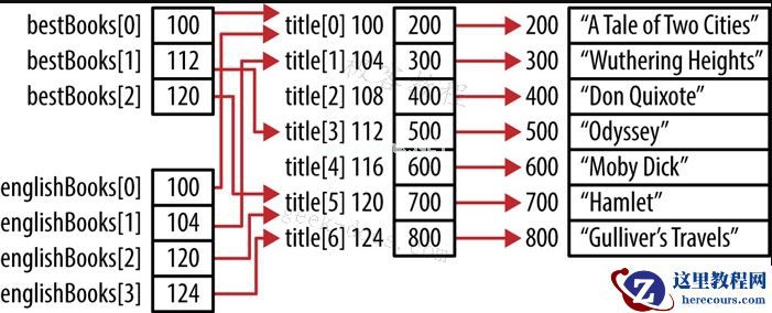 用多层间接引用可以为代码的编写和使用提供更多的灵活性,否则有些操作实现起来会困难一些。在本例中,如果书名的地址变了,那么只需要修改titles数组即可,不需要修改其他两个数组。