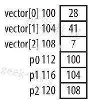 int vector[] = {28, 41, 7};int *pi = vector + 2; // pi: 108printf("%d\n",*pi); // 显示7pi--; // pi: 104printf("%d\n",*pi); // 显示41pi--; // pi: 100printf("%d\n",*pi); // 显示28pi每次减1,地址都会减4。