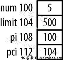 num - Address: 100 value: 5limit - Address: 104 value: 500 pi - Address: 108 value: 100 pci - Address: 112 value: 104