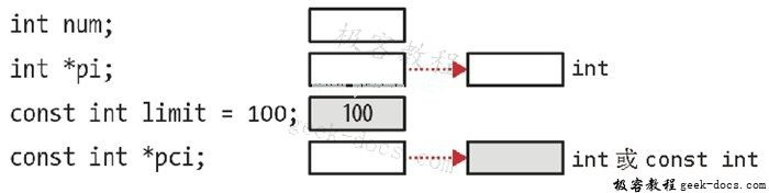 int num = 5;const int limit = 500;int *pi; // 指向整数const int *pci; // 指向整数常量pi = #pci = &limit;
