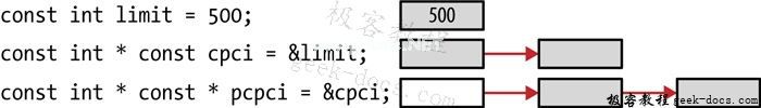 指向“指向常量的常量指针”的指针可以用图1-15来说明。