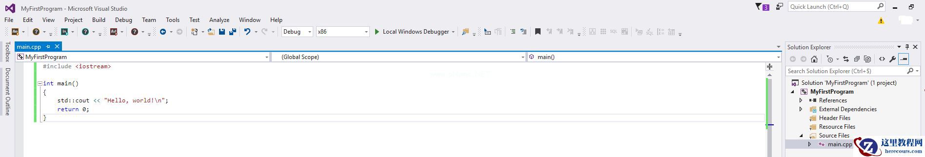 #include <iostream>int main(){ std::cout << "Hello World!\n"; return 0;}界面如下所示: