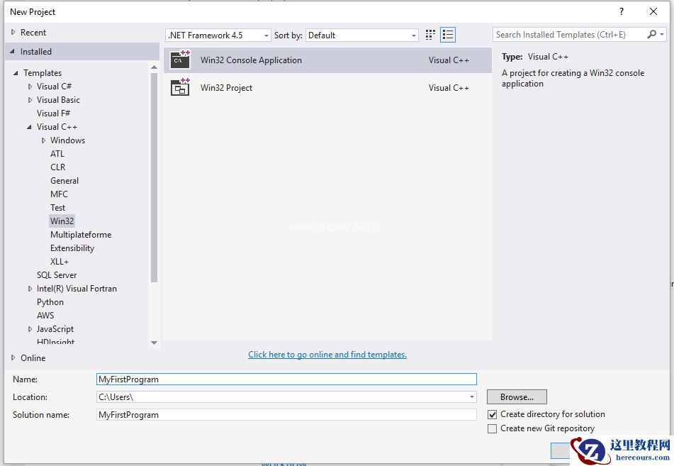 4、左侧列表选择 Templates -> Visual C++ -> Win32 Console Application,并设置项目名为 MyFirstProgram。