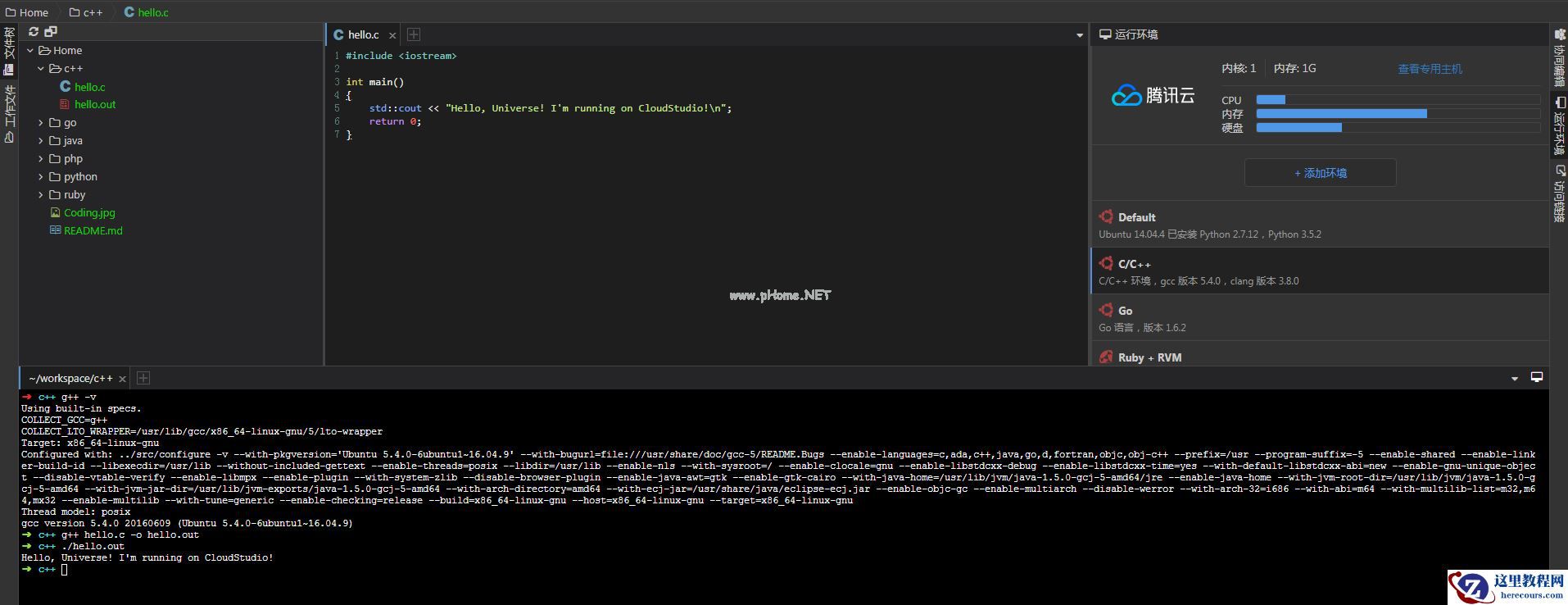 step1:访问腾讯云开发者平台,注册/登录账户。step2:在右侧的运行环境菜单选择:"C/C++" 运行环境,通过命令:g++ -v 可以查看 GCC 是否安装成功以及 GCC 的版本、配置信息step3:在左侧代码目录中新建c++代码目录编写你的c++代码step4 : 在终端中进入c++代码目录, 输入命令:g++ hello.c -o hello.out 编译刚才我们编写代码 -o 参数是用来指定生成机器码文件的文件名以便于区分,之后目录中生成了一个 hello.out 的机器码文件step5 : 在终端中输入命令:./hello.out 便可以看见我们编写的程序的输出结果了/*代码示例*/#include <iostream>int main(){ std::cout << "Hello, Universe! I'm running on Cloud Studio!\n"; return 0;}Tips: 从终端中输入命令可以看出 Cloud Studio 为我们集成了 Ubuntu16.04.1 + GCC5.4 + Clang3.5.2 的开发环境: