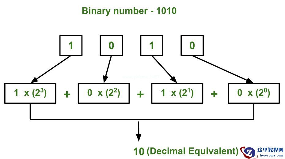下图说明了如何将(1010)转换为等效的十进制值:
