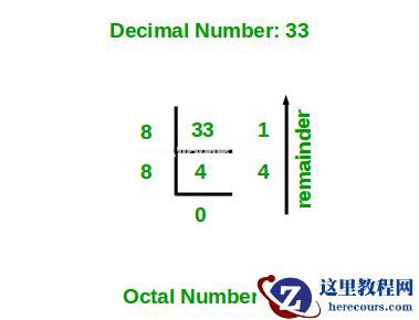下面的图示例演示了将十进制数33转换为等效的八进制数。