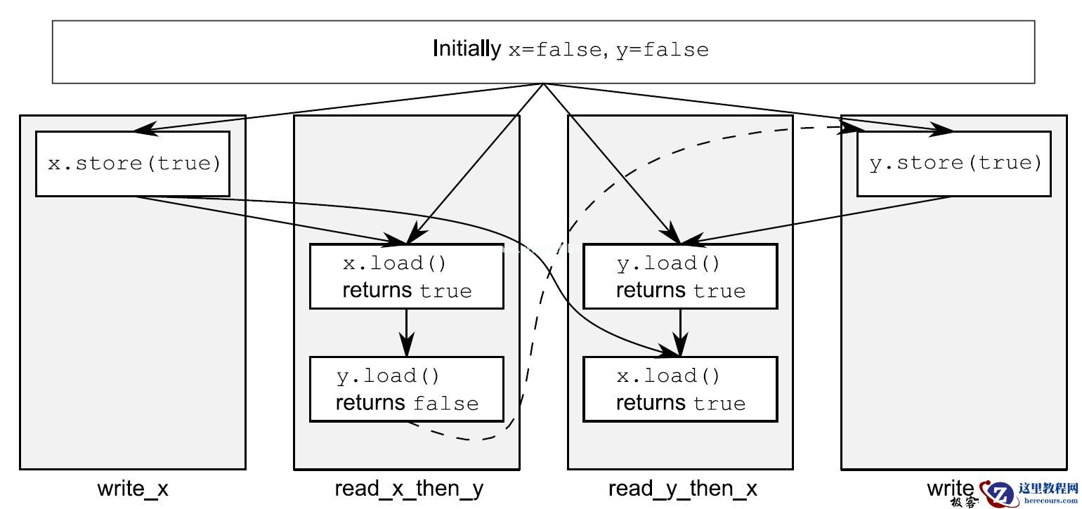 虚线始于read_x_then_y中对y的加载操作,到达write_y中对y的存储,其暗示了排序关系需要保持序列一致:在操作的全局操作顺序memory_order_seq_cst中,加载操作必须在存储操作之前发生,就产生了图中的结果。