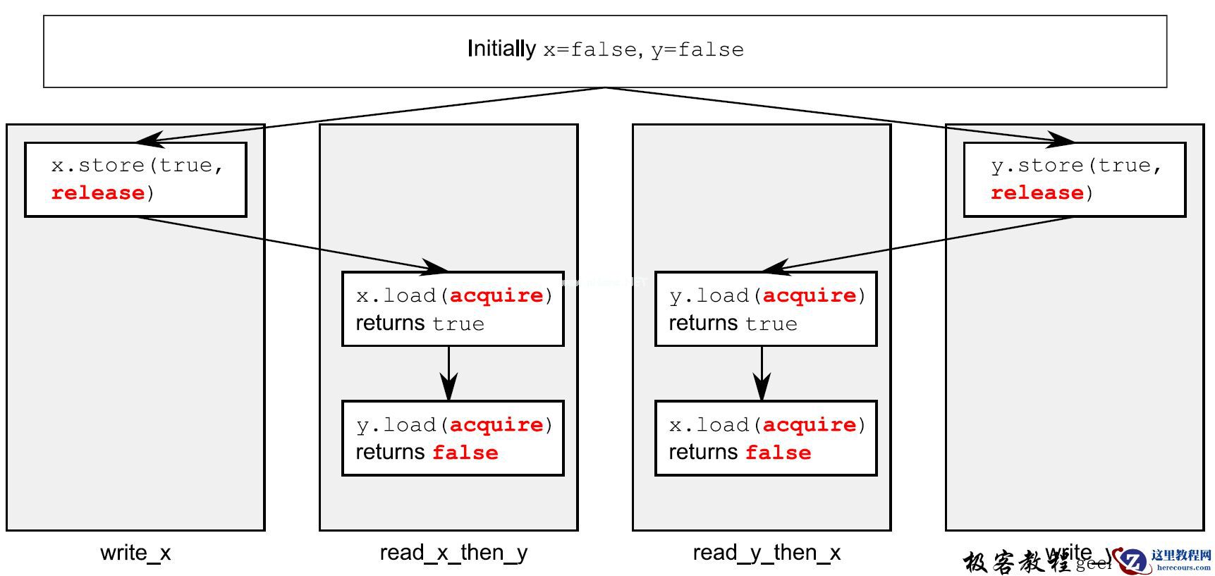 #include <atomic>#include <thread>#include <assert.h>std::atomic<bool> x,y;std::atomic<int> z;void write_x(){ x.store(true,std::memory_order_release);}void write_y(){ y.store(true,std::memory_order_release);}void read_x_then_y(){ while(!x.load(std::memory_order_acquire)); if(y.load(std::memory_order_acquire)) // 1 ++z;}void read_y_then_x(){ while(!y.load(std::memory_order_acquire)); if(x.load(std::memory_order_acquire)) // 2 ++z;}int main(){ x=false; y=false; z=0; std::thread a(write_x); std::thread b(write_y); std::thread c(read_x_then_y); std::thread d(read_y_then_x); a.join(); b.join(); c.join(); d.join(); assert(z.load()!=0); // 3}在这个例子中断言③可能会触发(就如同自由排序那样),因为可能在加载x②和y①的时候,读取到的是false。因为x和y是由不同线程写入,所以序列中的每一次释放到获取都不会影响到其他线程的操作。