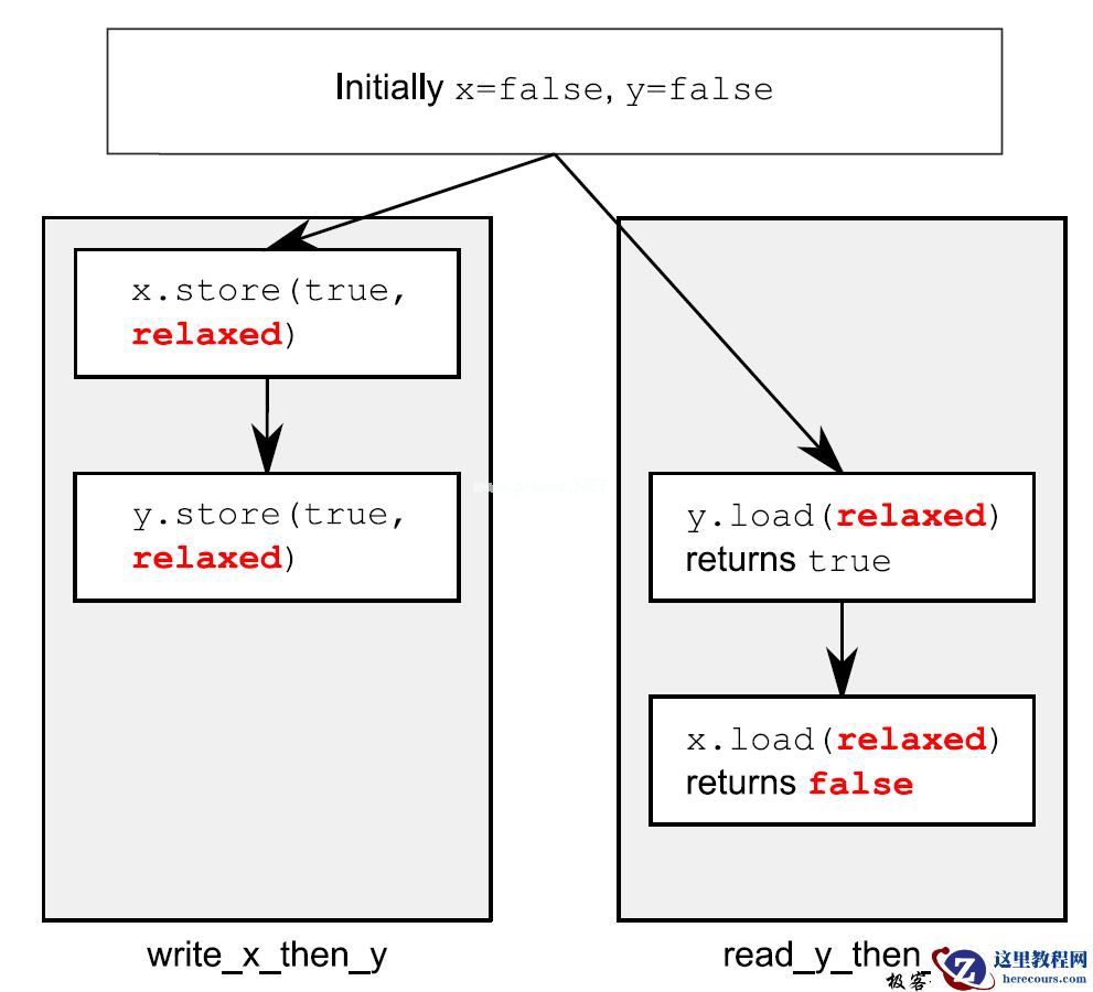 #include <atomic>#include <thread>#include <assert.h>std::atomic<bool> x,y;std::atomic<int> z;void write_x_then_y(){  x.store(true,std::memory_order_relaxed);  // 1  y.store(true,std::memory_order_relaxed);  // 2}void read_y_then_x(){  while(!y.load(std::memory_order_relaxed));  // 3  if(x.load(std::memory_order_relaxed))  // 4    ++z;}int main(){  x=false;  y=false;  z=0;  std::thread a(write_x_then_y);  std::thread b(read_y_then_x);  a.join();  b.join();  assert(z.load()!=0);  // 5}