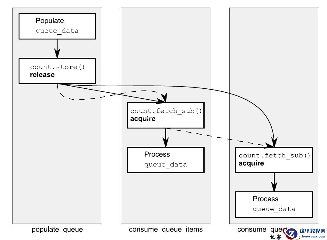 #include <atomic>#include <thread>std::vector<int> queue_data;std::atomic<int> count;void populate_queue(){  unsigned const number_of_items=20;  queue_data.clear();  for(unsigned i=0;i<number_of_items;++i)  {    queue_data.push_back(i);  }  count.store(number_of_items,std::memory_order_release);  // 1 初始化存储}void consume_queue_items(){  while(true)  {    int item_index;    if((item_index=count.fetch_sub(1,std::memory_order_acquire))<=0)  // 2 一个“读-改-写”操作    {      wait_for_more_items();  // 3 等待更多元素      continue;    }    process(queue_data[item_index-1]);  // 4 安全读取queue_data  }}int main(){  std::thread a(populate_queue);  std::thread b(consume_queue_items);  std::thread c(consume_queue_items);  a.join();  b.join();  c.join();}