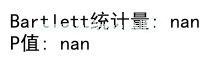 from scipy.stats import bartlettgroup1 = [1, 2, 3, 4, 5]group2 = [1, 2, 3, 4, 5]group3 = [1, 2, 3, 4, 5]statistic, p_value = bartlett(group1, group2, group3)print("Bartlett统计量:", statistic)print("P值:", p_value)Output: