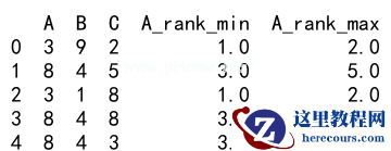 import pandas as pdimport numpy as npdata = { 'A': np.random.randint(1, 10, 5), 'B': np.random.randint(1, 10, 5), 'C': np.random.randint(1, 10, 5)}df = pd.DataFrame(data)df['A_rank_min'] = df['A'].rank(method='min')df['A_rank_max'] = df['A'].rank(method='max')print(df)Output: