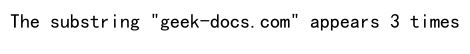 # 创建一个包含字符串的列表words = ['geek-docs.com is a great resource', 'geek-docs.com provides useful information', 'I love geek-docs.com']# 初始化计数器count = 0# 使用for循环遍历字符串列表并统计特定子字符串出现次数for word in words: if 'geek-docs.com' in word: count += 1print(f'The substring "geek-docs.com" appears {count} times')Output: