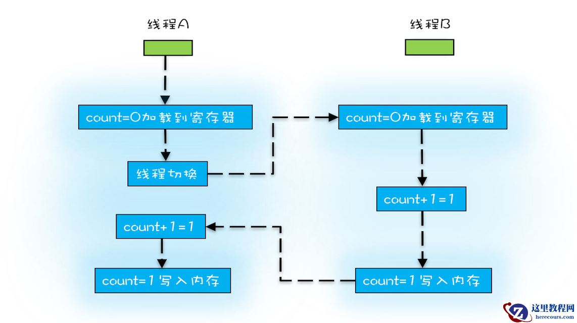 指令1:首先,需要把变量count从内存加载到CPU的寄存器;指令2:之后,在寄存器中执行+1操作;指令3:最后,将结果写入内存(缓存机制导致可能写入的是CPU缓存而不是内存)。操作系统做任务切换,可以发生在任何一条CPU指令执行完,是的,是CPU指令,而不是高级语言里的一条语句。