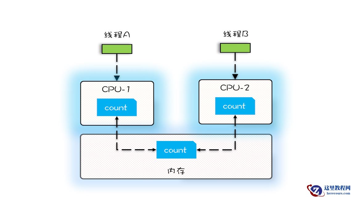 我们假设线程A和线程B同时开始执行,那么第一次都会将 count=0 读到各自的CPU缓存里,执行完 count+=1 之后,各自CPU缓存里的值都是1,同时写入内存后,我们会发现内存中是1,而不是我们期望的2。之后由于各自的CPU缓存里都有了count的值,两个线程都是基于CPU缓存里的 count 值来计算,所以导致最终count的值都是小于20000的。这就是缓存的可见性问题。