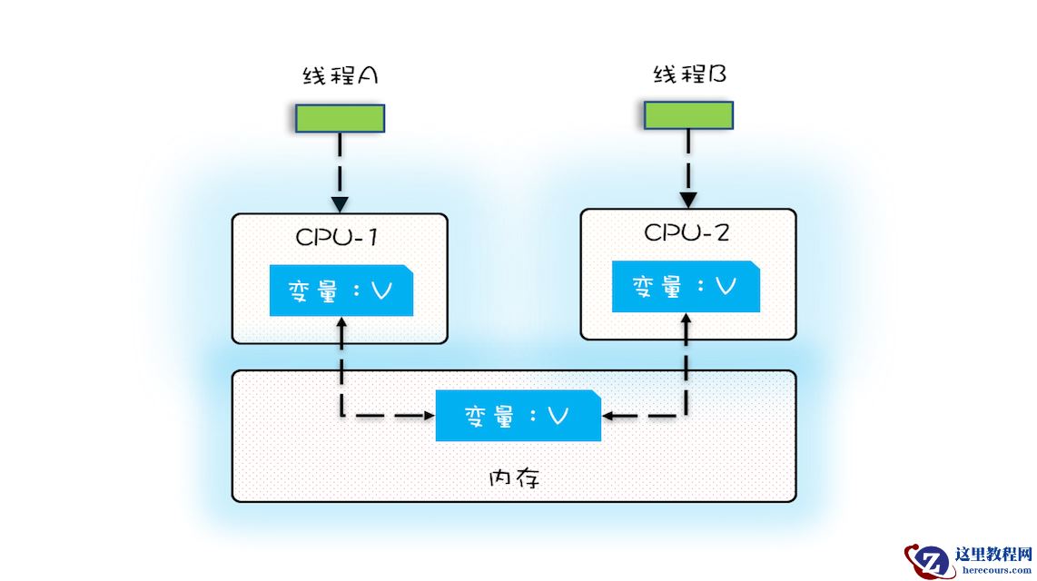 多核时代,每颗CPU都有自己的缓存,这时CPU缓存与内存的数据一致性就没那么容易解决了,当多个线程在不同的CPU上执行时,这些线程操作的是不同的CPU缓存。比如下图中,线程A操作的是CPU-1上的缓存,而线程B操作的是CPU-2上的缓存,很明显,这个时候线程A对变量V的操作对于线程B而言就不具备可见性了。这个就属于硬件程序员给软件程序员挖的“坑”。