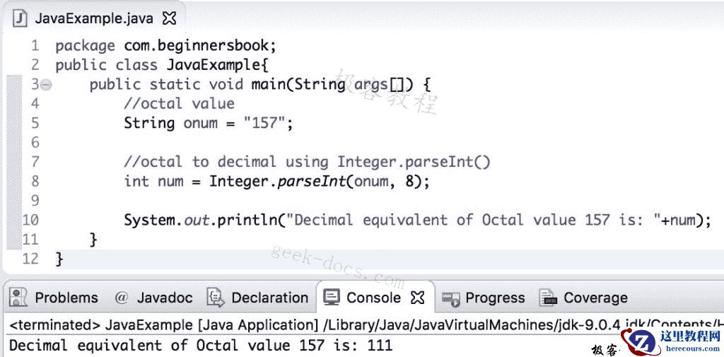 在Integer.parseInt()方法中,我们将基数传递为 8,因为八进制数的基值是 8。如果你记得十六进制到十进制转换,我们有传递基数为 16 进行转换。