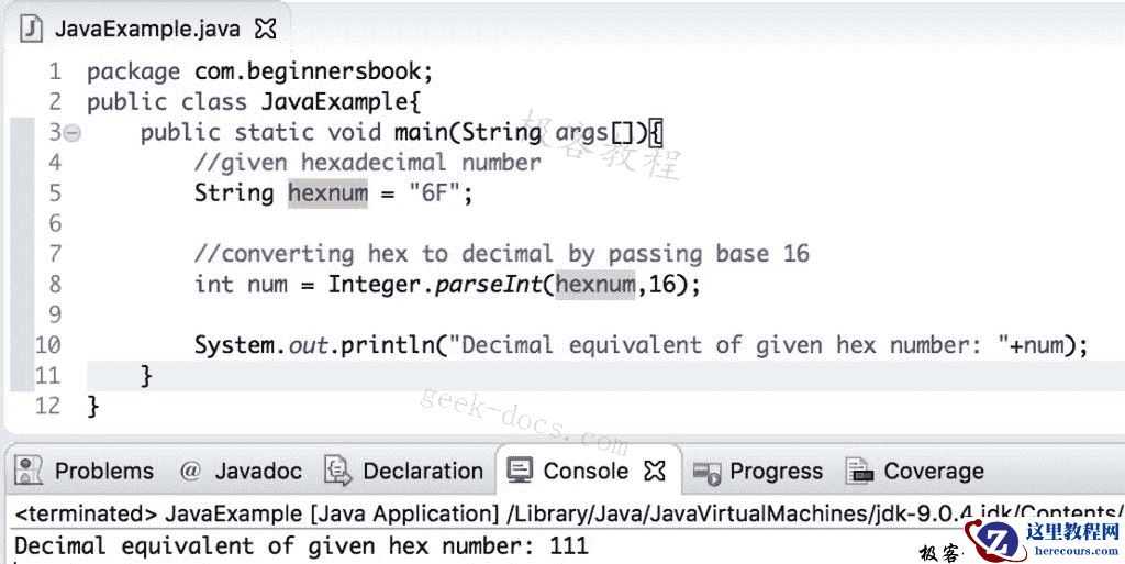 这里我们给出了一个十六进制数hexnum,我们通过使用Integer.parseInt()方法将其转换为十进制数,并将基数传递为 16。