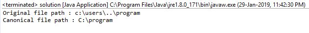 // Java program to demonstrate the// use of getCanonicalPath() function import java.io.*;public class solution { public static void main(String args[]) { // try-catch block to handle exceptions try { // Create a file object File f = new File("c:\\users\\..\\program"); // Get the Canonical path of file f String canonical = f.getCanonicalPath(); // Display the file path of the file object // and also the file path of Canonical file System.out.println("Original file path : " + f.getPath()); System.out.println("Canonical file path : " + canonical); } catch (Exception e) { System.err.println(e.getMessage()); } }}输出