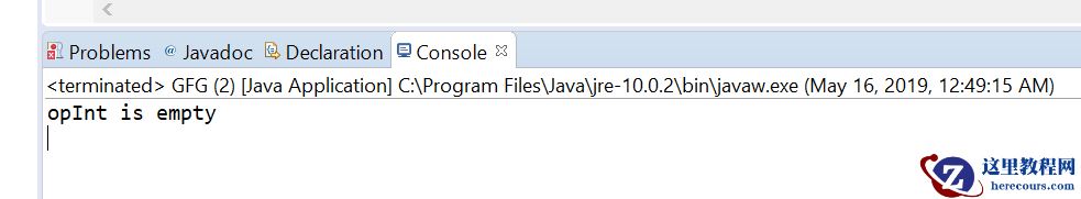 // Java program to demonstrate// OptionalInt.orElseThrow(Supplier) methodimport java.io.IOException;import java.util.OptionalInt; public class GFG { public static void main(String[] args) { // create a OptionalInt OptionalInt opint = OptionalInt.empty(); // apply orElseThrow(Supplier) int value; try { value = opint.orElseThrow(IOException::new); } catch (IOException e) { System.out.println("Exception " + e); } }}输出: