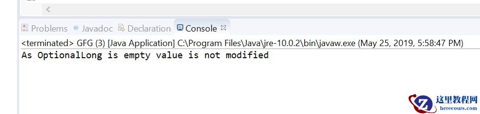 // Java program to demonstrate// OptionalLong.ifPresent(LongConsumer) method import java.util.OptionalLong; public class GFG { public static void main(String[] args) { // create a OptionalLong OptionalLong oplong = OptionalLong.empty(); // apply ifPresent(LongConsumer) oplong.ifPresent((value) -> { value = value * 132435; System.out.println("Value:=> " + value); }); System.out.println("As OptionalLong is empty value" + " is not modified"); }}输出: