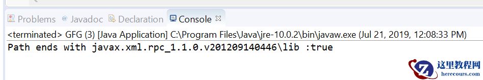 // Java program to demonstrate// java.nio.file.Path.(Path other) method import java.nio.file.Path;import java.nio.file.Paths;public class GFG { public static void main(String[] args) { // create an object of Path Path path = Paths.get("D:\\eclipse" + "\\plugins" + "\\javax.xml.rpc_1.1.0.v201209140446" + "\\lib"); // create a path object which we will pass // to endsWith method to check functionality // of endsWith(Path other) method Path passedPath = Paths.get( "javax.xml.rpc_1.1.0.v201209140446" + "\\lib"); // call endsWith() to check path object // ends with passedPath or not boolean check = path.endsWith(passedPath); // print result System.out.println("Path ends with " + passedPath + " :" + check); }}输出: