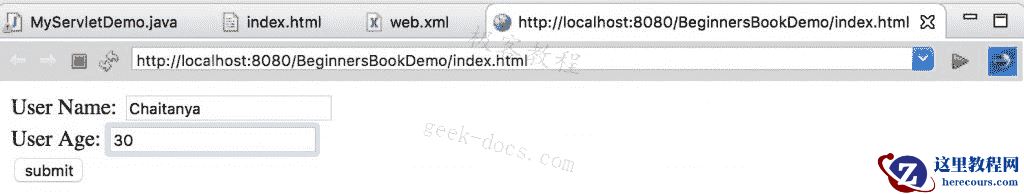 <form action="details" method="get"> User Name: <input type="text" name="uname"><br> User Age: <input type="text" name="uage"><br> <input type="submit" value="submit"></form>