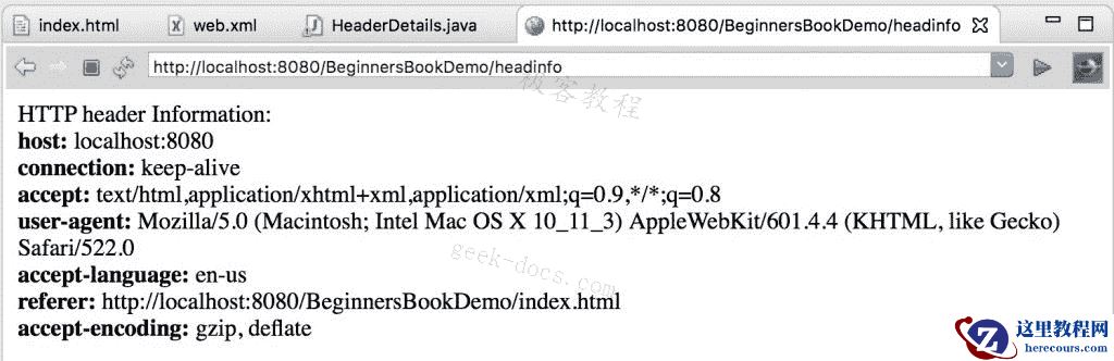 import java.io.IOException;import java.io.PrintWriter;import java.util.Enumeration;import javax.servlet.ServletException;import javax.servlet.http.HttpServlet;import javax.servlet.http.HttpServletRequest;import javax.servlet.http.HttpServletResponse;public class HeaderDetails extends HttpServlet { public void doGet(HttpServletRequest request, HttpServletResponse response) throws IOException, ServletException { response.setContentType("text/html"); PrintWriter pwriter = response.getWriter(); pwriter.println("HTTP header Information:<br>"); Enumeration en = request.getHeaderNames(); while (en.hasMoreElements()) { String hName = (String) en.nextElement(); String hValue = request.getHeader(hName); pwriter.println("<b>"+hName+": </b>" +hValue + "<br>"); } }}web.xml