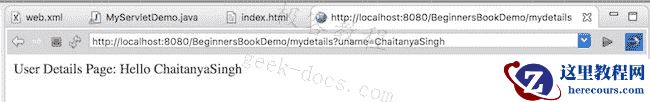 import javax.servlet.http.*;import javax.servlet.*;import java.io.*;public class MyServletDemo extends HttpServlet{ public void doGet(HttpServletRequest req,HttpServletResponse res) throws ServletException,IOException { res.setContentType("text/html"); PrintWriter pwriter=res.getWriter(); String name=req.getParameter("uname"); pwriter.println("User Details Page:"); pwriter.println("Hello "+name); pwriter.close(); }}web.xml