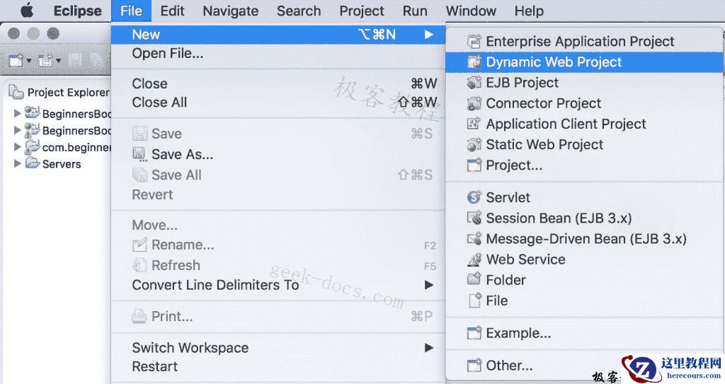 让我们在 Eclipse 中创建一个 Servlet 应用。打开 Eclipse,然后单击“文件❯新建❯动态 Web 项目”。