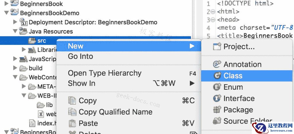 我们正在创建一个 html 文件,一旦我们点击网页上的链接就会调用 servlet。在WebContent文件夹中创建此文件。文件的路径应如下所示:WebContent/index.html