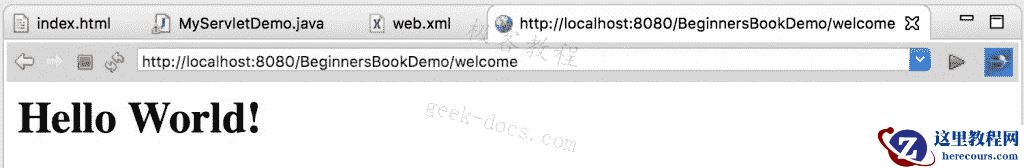 此文件可在此路径WebContent/WEB-INF/web.xml中找到。在此文件中,我们将使用特定 URL 映射 Servlet。由于我们在单击index.html页面上的链接时调用欢迎页面,因此我们将欢迎页面映射到我们上面创建的 Servlet 类。