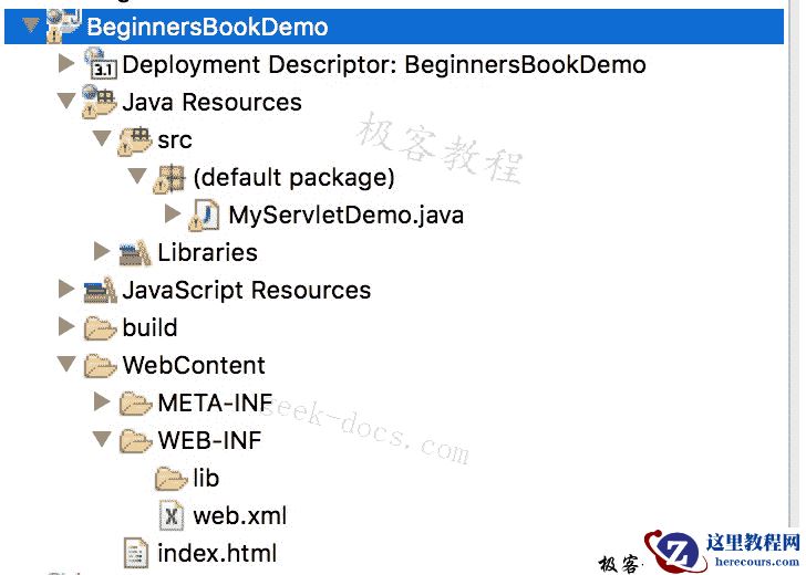 我们通过扩展HttpServlet类来创建一个HttpServlet。右键单击src文件夹并创建一个新的类文件,将该文件命名为MyServletDemo。文件路径应如下所示:Java Resources/src/default package/MyServletDemo.java